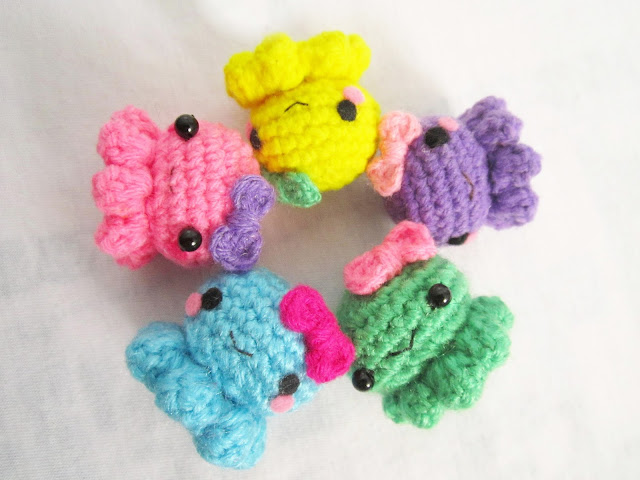 This is a free pattern from Berrysprite but i’ve modified a little for tentacles. It’s very easy to make and can finish making it in less than an hour. I ended up making them in different colors and attached a tiny bow for a more kawaii look.