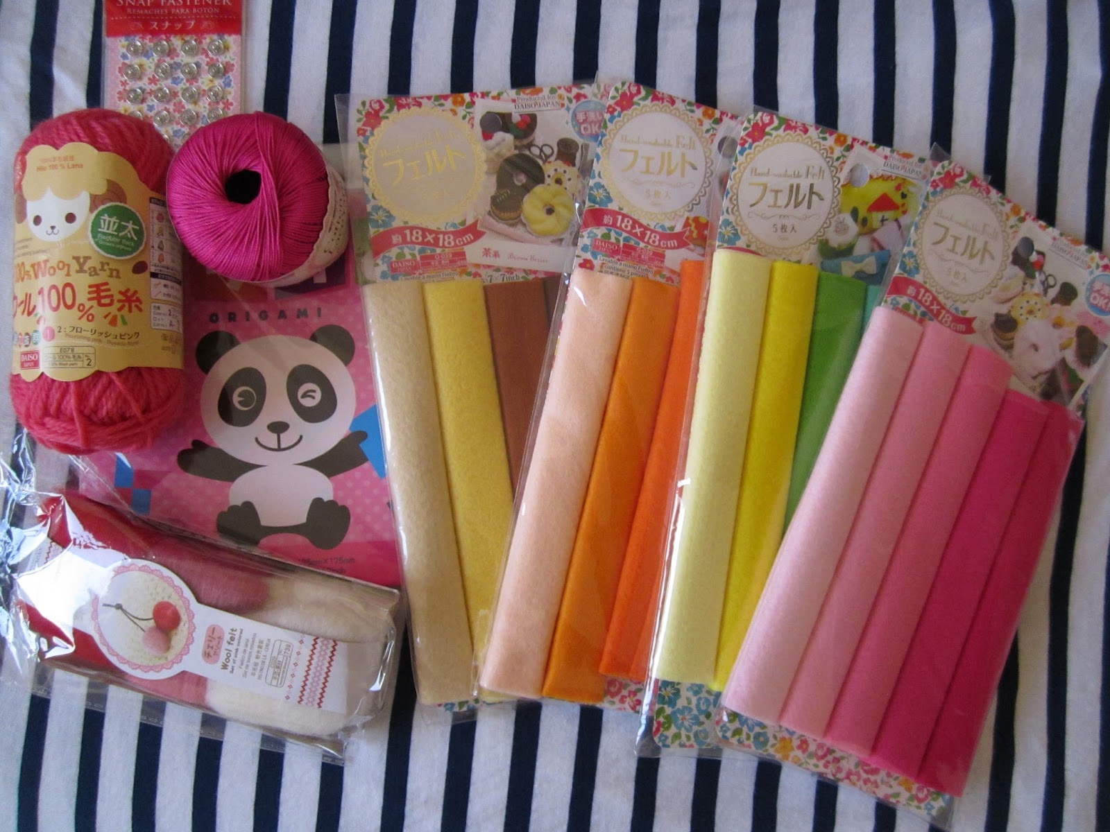 This weekend i dragged my husband to Daiso and bought some colorful felts and yarn.. I have to be content with this for now as i was getting some furious glance from my husband while i tried to pile more into the cart..